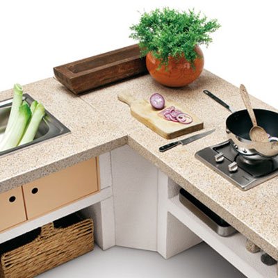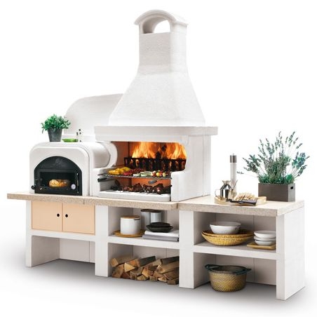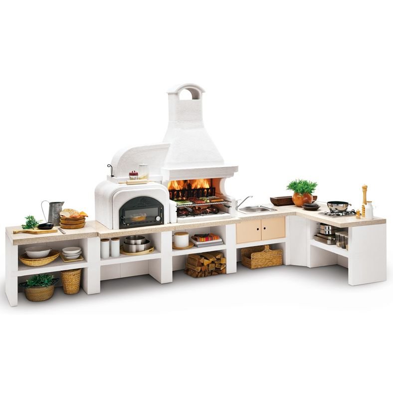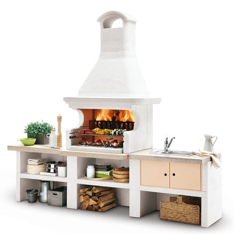 Выполнена из совместимых модулей. Столешница из полированного камня Marmotech. Основания всех модулей имеют заднюю стенку. Стальная решетка для дров и решетка из нержавеющей стали 76х40 с бакелитовыми ручками. Общие размеры: 450х85х218 cм.