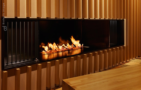 Встраиваемый биокамин, декорированный металлическими прутьями-сладерами.