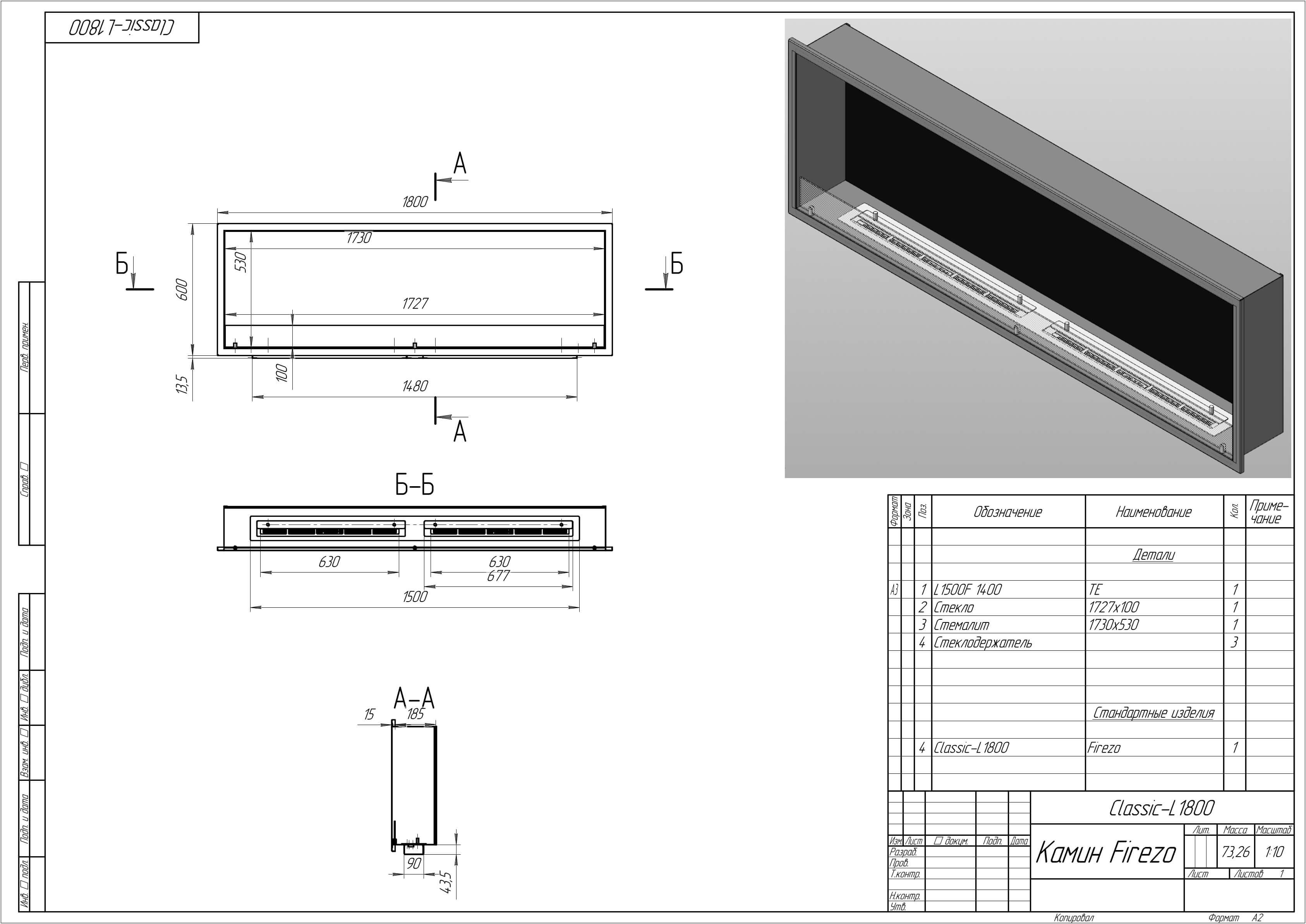 - Базовые размеры камина: 1800x200x450 мм