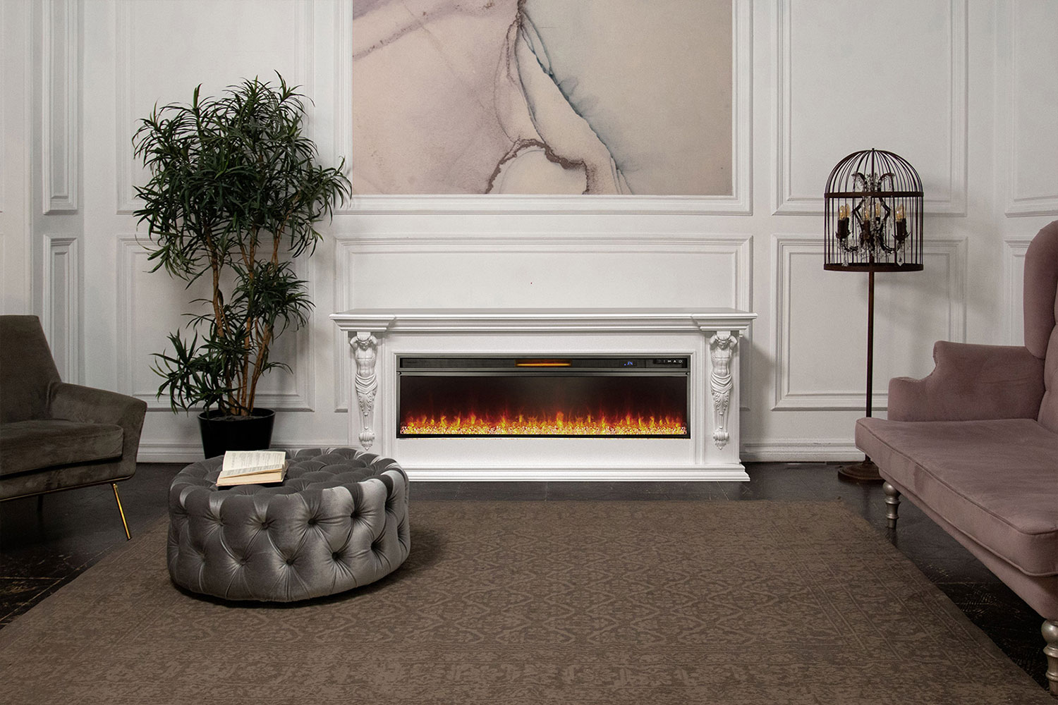 Sparta 60 – деревянный линейный портал в античном стиле. Боковые колонны декорированы объемными фигурами атлантов, поддерживающими выступающую вперед каминную полку. Портал больше походит для установки в просторных помещениях. Гармонично впишется практически в любой классический интерьер.
