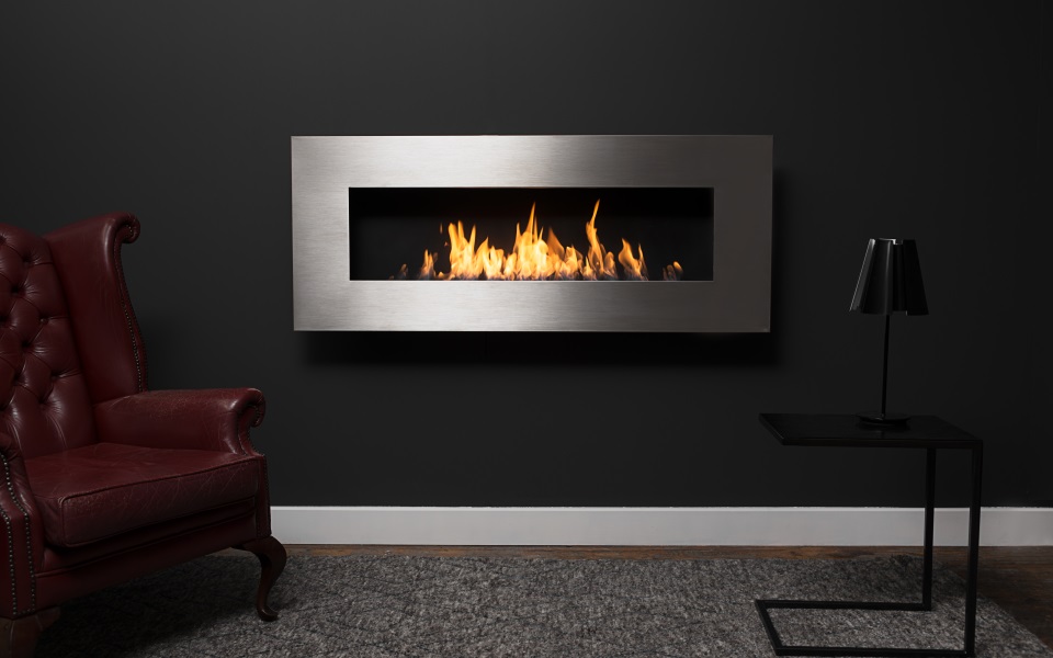 Настенный биокамин Nero 1450SS с декоративной рамкой из брашированной нержавеющей стали комплектуется горелкой ICON FIRES Slimline 1100mm.