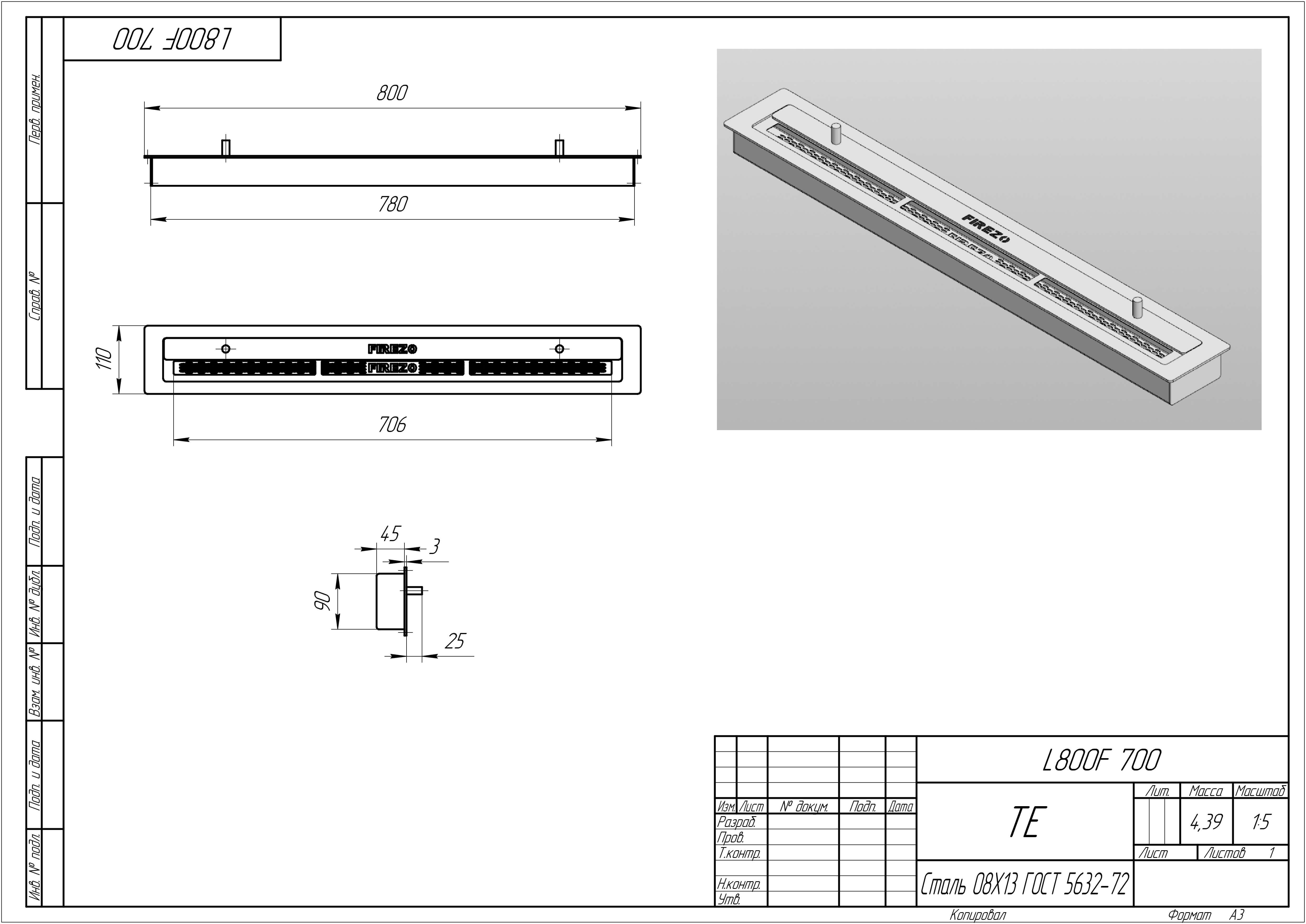 Биокамин Firezo Burner 800 имеет длину 900, но может быть изготовлен на заказ по вашим индивидуальным размерам. Линия огня имеет прямоугольную форму. Сварная конструкция очага гарантирует монолитность биокамина и исключает любые возможные проблемы, которые могут возникнуть в результате деформации резьбовых соединений под воздействием тепла после длительного использования.