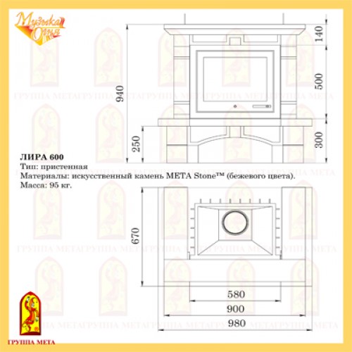 Каминная облицовка Лира 600 изготовлена из камня META Stone™ (бежевого цвета). Вставки в боковые панели выполнены из пеноблока и подготовлены для последующей отделки (может использоваться любая отделка, толщина материала не более 30 мм). Отделочный материал в комплект не входит.
