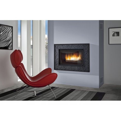 Полувстроенный камин с прямоугольной рамкой из стали и полированного бетона. Поверхность рамки с рельефным рисунком, что придает камину необычный и стильный вид.