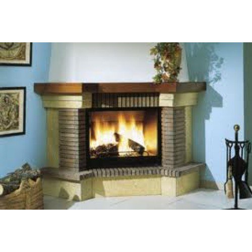 Угловой камин серии Stylo из Гарского камня. Плиты, боковые детали и консоль из огнеупорного кирпича толщиной 3 см. Металлическая топка 904, колосник и зольник.