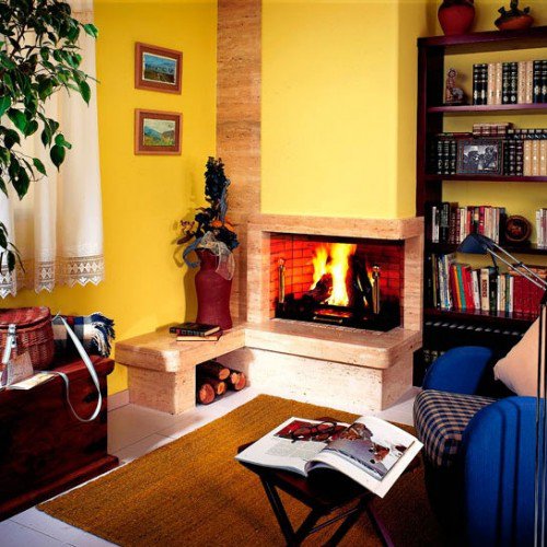 Угловой камин. Обрамление топки - полированный Travertin, пропитанный прозрачными смолами. Кирпичная топка, открытая сбоку.