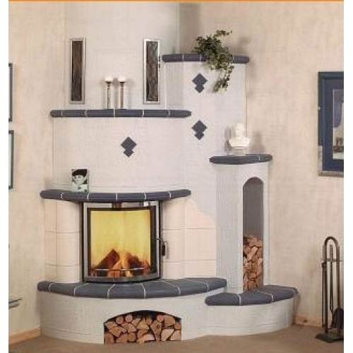 Камин Hark 3/126.4. Угловой камин. Изразцы белого цвета. Столешница и каминные полки из изразцов цвета jeans blau. Боковой дровник. Перед вами отличная модель внушительного размера, которая удачно сможет переменить ваш дом к лучшему, наполнив его замечательной энергией и уютом.