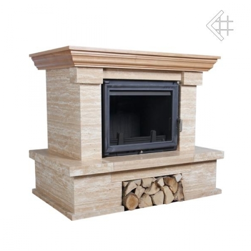 Облицовка для каминных топок класса Amelia/Felix. Пластины и верхняя панель выполнена у нее из полированного камня Trawertyn Classico. Стороны комплекта и база матовые. Фрезерованная дубовая балка.