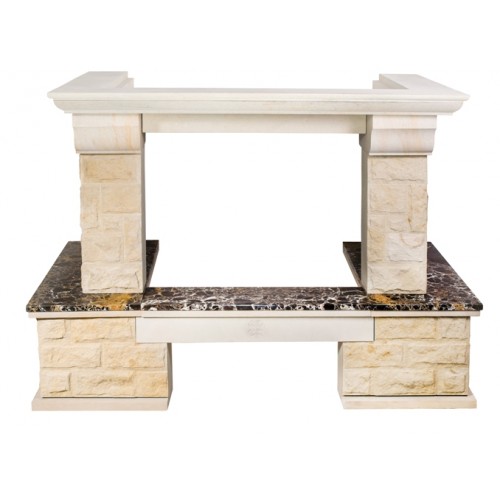 - Материал: колотый песчаник, золотистый цвет, полки и балка - мрамор Emperador GoldПодходящие топки шириной „700 мм” с прямым стеклом