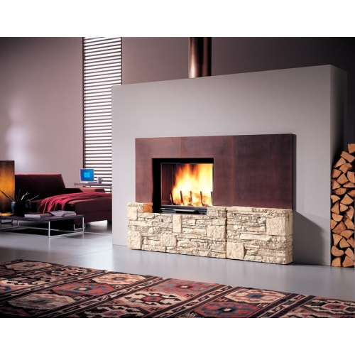 Пристенный камин Palazzetti Alaska из декоративного бетона, окрашенного с помощью натуральных оксидов в белый или золотисто-песочный цвет (по выбору) для реалистичного эффекта натурального камня, положенного всухую. Верхняя панель из декоративного материала, цвета античной меди или металла (по выбору).