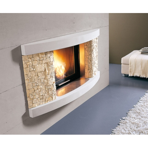 Пристенный камин Palazzetti Kioto. Боковые стенки из декоративного материала, окрашенного с помощью натуральных оксидов в белый или желтый цвет (по выбору) для реалистичного эффекта каменной мозаики. Внешние и внутренние стенки выполнены из неокрашенного декоративного материала. Стальная защитная поверхность напротив топки.