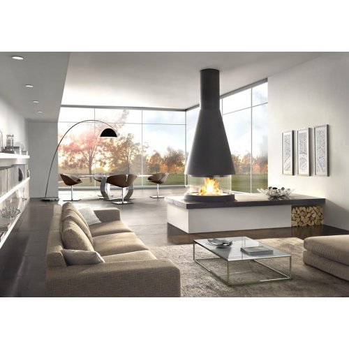 Как и все модели коллекции Panoramic, этот камин оснащен эксклюзивным механизмом подъема-спуска переднего круглого стекла.