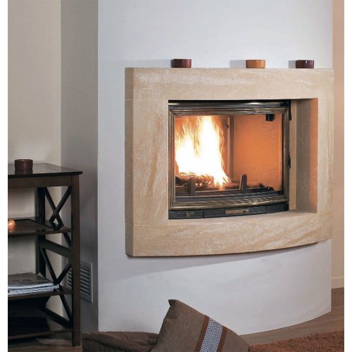 Модель камина выпуклой формы, выполненная из камня. Обрамление вокруг топки из мрамора бежевого цвета.