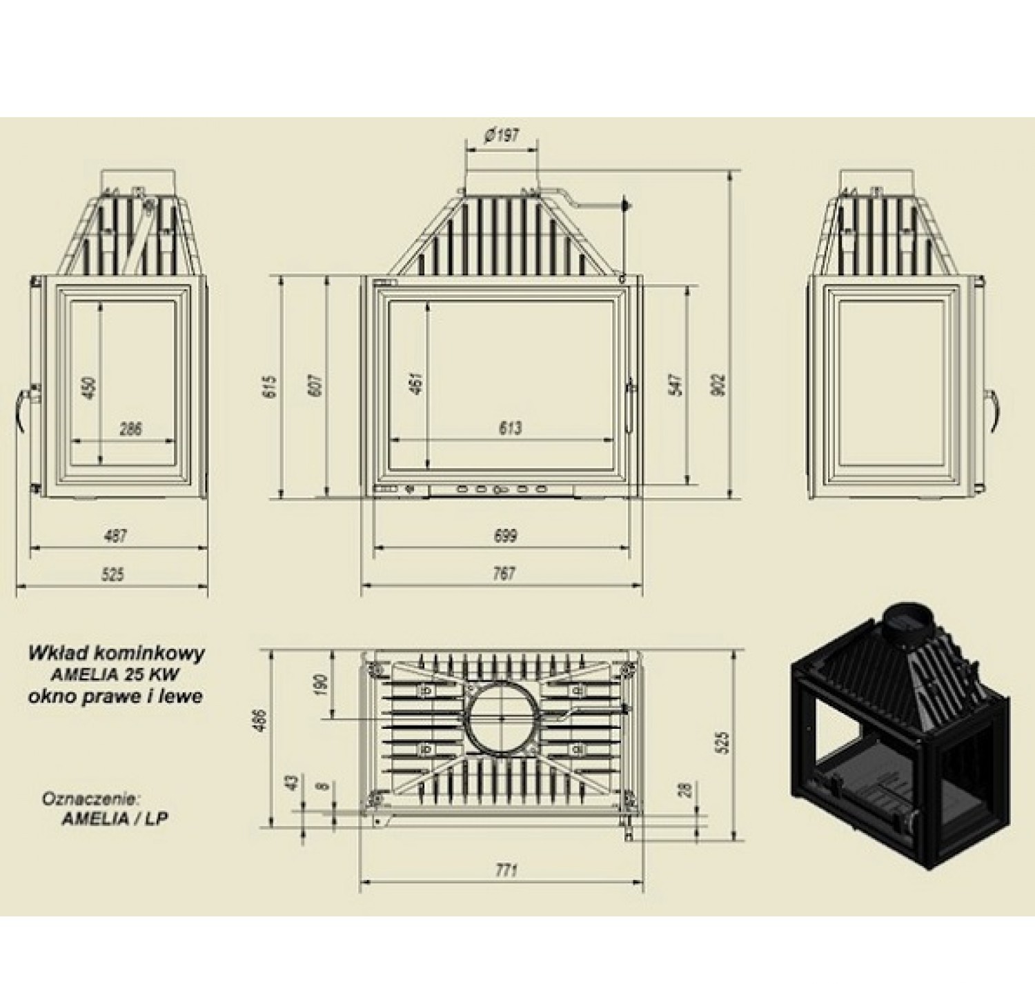 Amelia LР— топочная камера или топка-вкладыш, предназначенная для отопления дома площадью до250 кв.м. Модель самой большой производительности вряду чугунных топок отKRATKI. Данная модель предназначена для пристенных каминов— топки имеет 3-х стороннее остекление. Особенности оборудования серии Amelia LРотKRATKI: Чугунная топка непрерывного сгорания; Топка высокой мощности, предназначена для больших помещений; Топка с3-сторонем остеклением; Теплоемкость прибора увеличивают ребра повсему корпусу; Топливо— сухие дрова длиной до500 мм; Стекло— термостойкая стеклокерамика, предел нагрева 800 С; Полная герметичность дверцы; Система «двойного дожига»; Топка имеет съемную ручку надверце; Прозрачность стекла обеспечивает система встроенного обдува; Предусмотрен держатель дров— непозволяет рассыпаться при открытии дверцы; Дно топочной камеры имеет отверстие для золы.