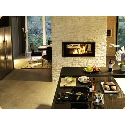 Двухсторонняя каминная топка с прямым стеклом. Топочная камера футерована шамотом. Подъёмный механизм двери (система Easy-Lift) с одной стороны. С другой стороны дверца откидывается для чистки. Возможен вариант топки с подъёмным механизмом с двух сторон (по запросу). Ширина дверки 982 мм. Высота дверки 422 мм. Возможно подключение воздуха из-вне.