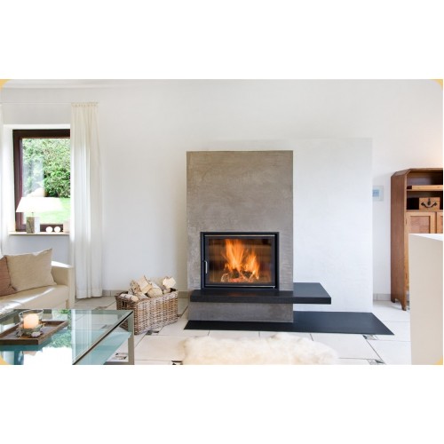 Стальная топка с прямым стеклом. Боковое открывание двери. Ширина дверки 656 мм, высота - 488 мм. Возможно подключение воздуха из-вне.