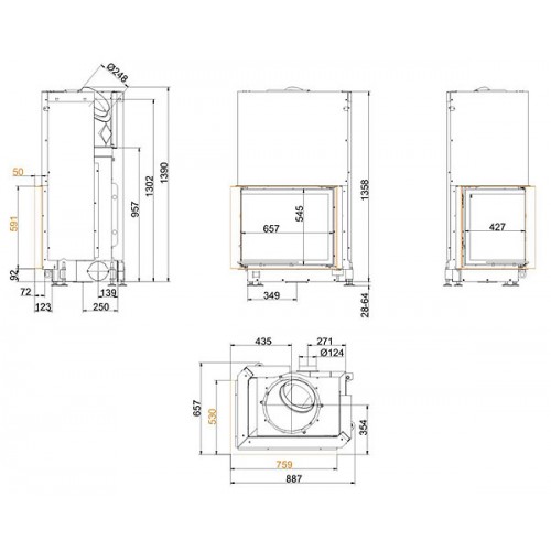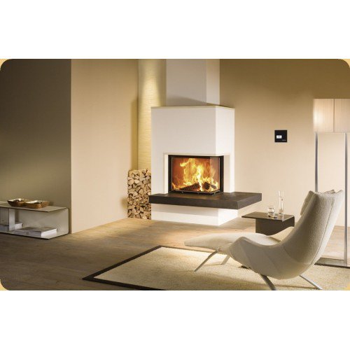 Угловая каминная топка с цельным Г-образным стеклом. Боковое стекло справа. Дверца с подъемным механизмом (система Easy-Lift). Топочная камера футерована шамотом. Ширина дверки 657/427 мм, высота - 545 мм. Возможно подключение воздуха из-вне.