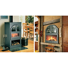 Опции: закрывающаяся решетка, рама для кирпичного камина, решетка для теплого воздуха и чугунная труба для подключения к дымоходу.