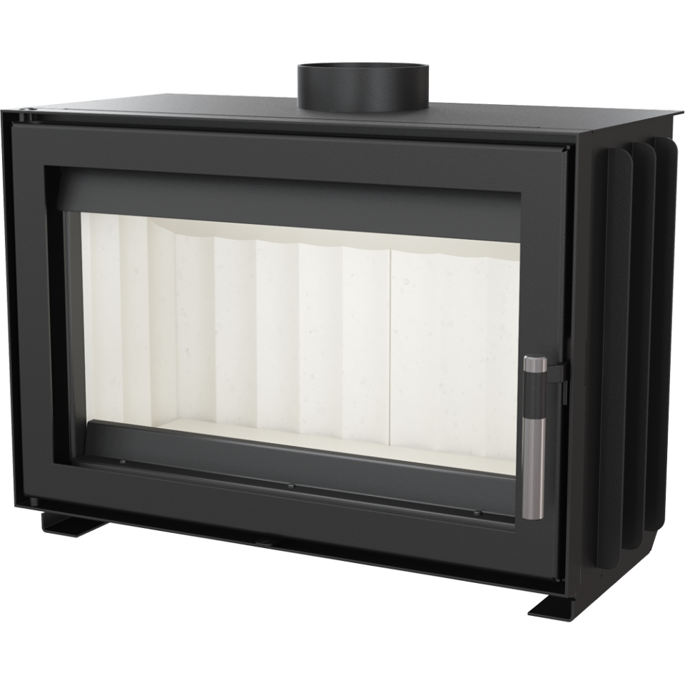 Корпус камеры изготовлен из специальной термостойкой стали, для улучшения тепловых характеристик камера изнутри выложена вермикулитом. Большое термостойкое стекло с системой самоочищения позволяет насладиться видом горящих дров. Дополняет современный вид камина стильная ручка.