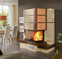 Высокий дымосборник, большой съемный зольник. Легкое обслуживание. Очаг с внутренними стенками из шамотного камня защищен керамическим стеклом, выдерживающим температуру до 750 градусов. Возможность эксплуатации с открытым очагом. Высокая производительность. Топка оснащена системой вторичного дожига и функцией самоочистки стекла. В качестве топлива используются дрова.