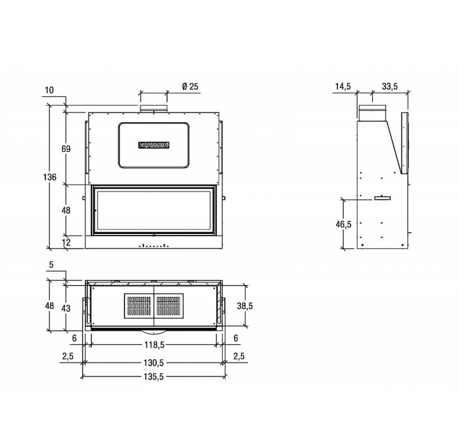 Топка имеет прямое стекло. Подъемная дверца с жаропрочным стеклом, что позволяет наслаждаться открытым огнем, которая открывается на петлях для чистки. Стальной кожух и внутреннее основание из чугуна обеспечивают прочность и долговечность. Имеет современный дизайн.