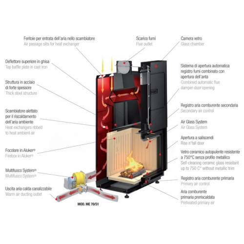 Топки серии ME могут быть оснащены эксклюзивной системой Multifuoco, которая гарантирует равномерное распределение тепла из комнаты, где установлена топка, в смежные комнаты. На  топку можно установить два комплекта Multifuoco, которыми можно управлять с одного пульта.
