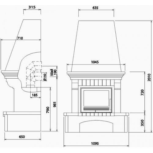 Данная модель камина относится к рустикальному (деревенскому) стилю, для облицовки которых используются натуральные материалы с неровной шероховатой поверхностью, а конструкция предполагает высокий дымоходный колпак и каминную балку. Белый кожух поставляется в комплекте. Высота термокороба составляет 270 см. При монтаже камина в коробе необходимо установить дополнительные вентиляционные решетки.