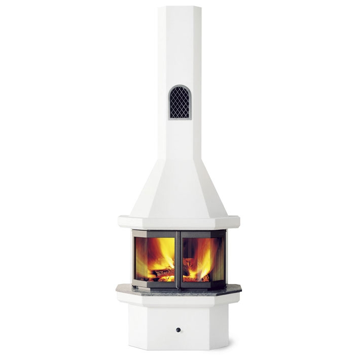 Угловая печь-камин с задним подключением дымохода и раздвижными дверцами.