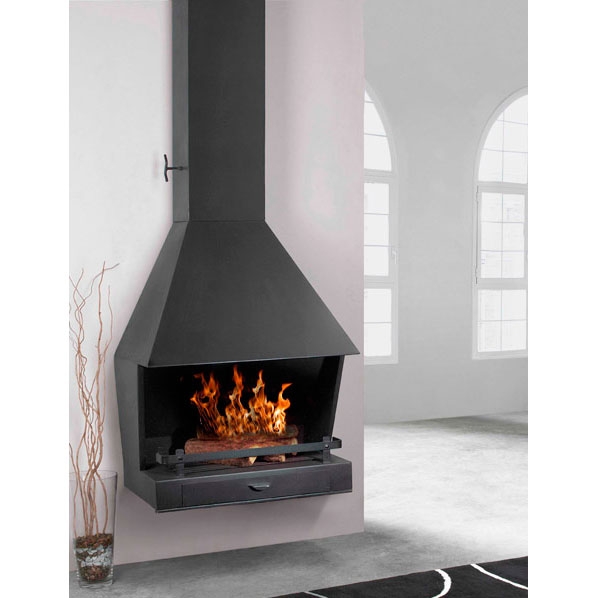 Подвесной фронтальный металлический камин. Зольник с колосником встроены в нижнюю часть камина. Снабжен телескопическим элементом 2,60 и крепежом к потолку, дымоход диаметром 20 см.