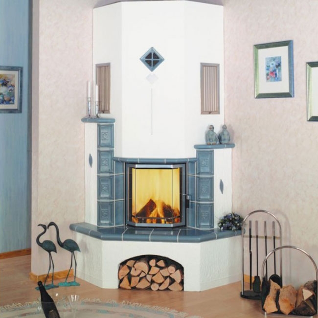 Такой камин украсит комнату и будет обогревать Вас в холодные вечера. Камин способен быстро и эффективно нагреть помещение и долгое время сохранять тепло. Через стеклянную дверцу топки можно контролировать процесс горения. Столешница и боковые стойки оформлены изразцами.