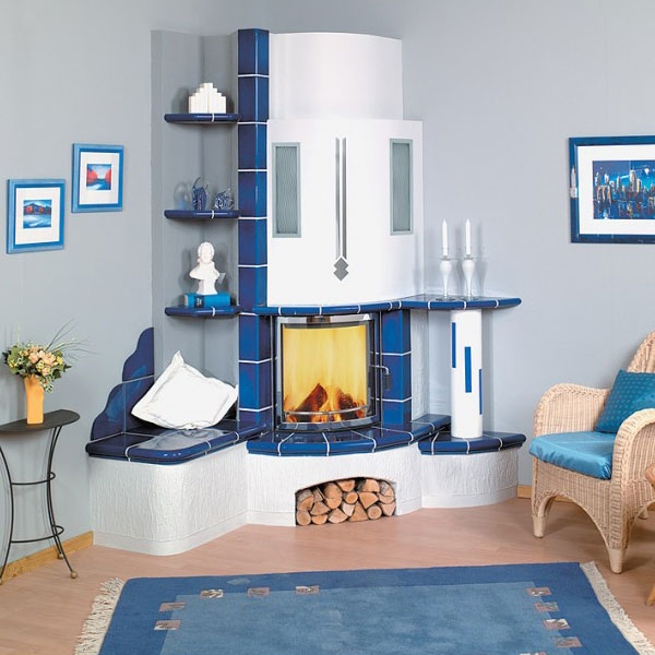 Каминный ансамбль отличается оригинальным исполнением и необычной красотой. Комбинированная облицовка из белого мрамора в сочетании с изразцами синего цвета придает камину неповторимый и красивый вид. С боковой стороны расположены стеклянные полки для декоративных предметов интерьера, внизу- банкетка для отдыха. Панорамное стекло топки дает возможность наслаждаться красотой огня и контролировать процесс горения.