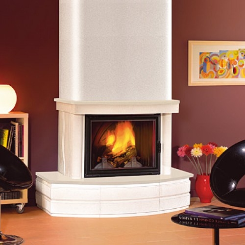 Пристенная облицовка. Изготовлена из белого Эдельрока + пластина Crema Marfil. Облицовка оснащена элементами, позволяющими установить открытую или закрытую дровницу.