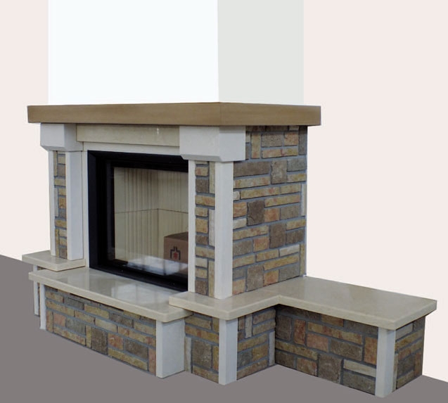 Каминная облицовка с банкетой справа 70 см. Основной материал: рваный Vicentino. Материал полки: полированный Trani.