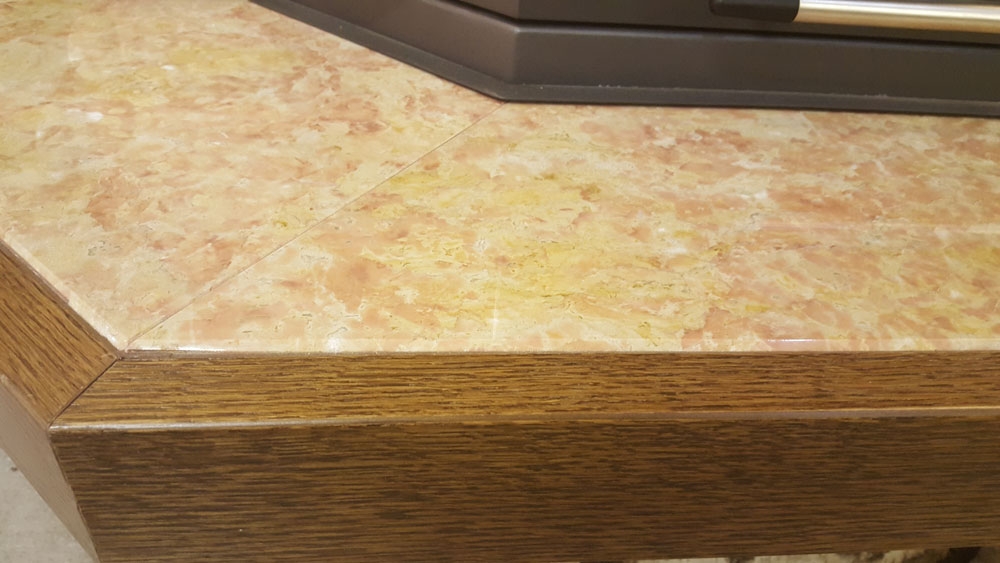 Пристенный камин из шлифованного мрамора Giallo Reale. Столешница из полированного мрамора Giallo Reale с деревянной каймой. Каминная полка облицована шпоном Rovere под орех.