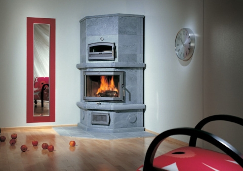Верхнее подключение дымохода. Угловая печь-камин с духовкой. 3 тепловой класс.