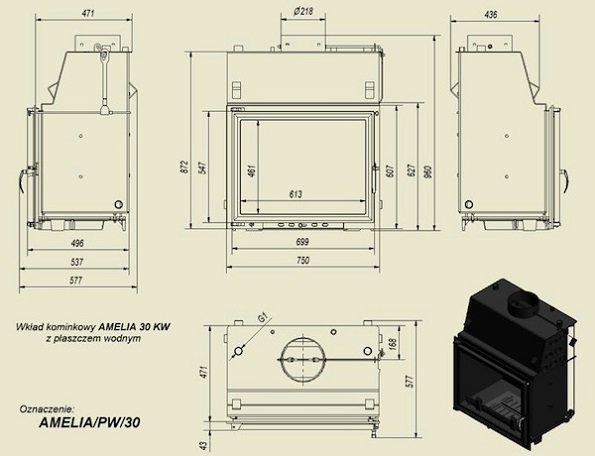 Топка с водяным контуром AMELIA/PW/30/GLASS, двойное стекло