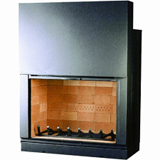 Каминная трехсторонняя топка с очагом, облицованным специальным огнеупорным камнем. Цвет черный, кирпичи - серого цвета.