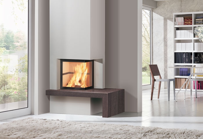 Угловая дровяная топка с внутренней частью из огнеупорного материала и обширным обзором огня.