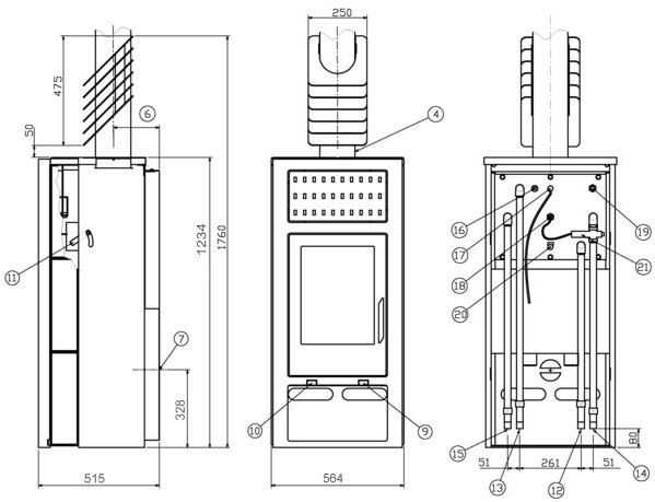 Модель Belt 10 Аква относится как раз к таким печам «с водяной рубашкой» и может отапливать до 220 куб. метров полезной площади. В качестве каминного топлива рекомендовано использовать дрова, а также древесные или угольные брикеты. Расход топлива – от 1.9 до 2.9 кГ в час. Мощность камина – 10 кВт, из которых 6 кВт приходится на теплообменник. Печь имеет прямоугольный стальной корпус, обшитый пластинами из талькохлорита, и верхнее подсоединение к дымоходной системе.