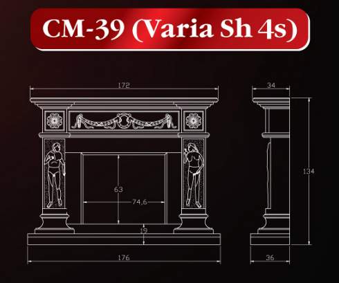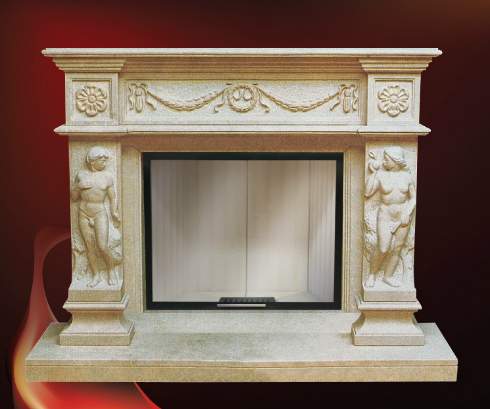 Фронтальный камин выполнен в классическом стиле под дровяную топку с прямым стеклом. Облицовка декорирована художественными элементами ручной работы.