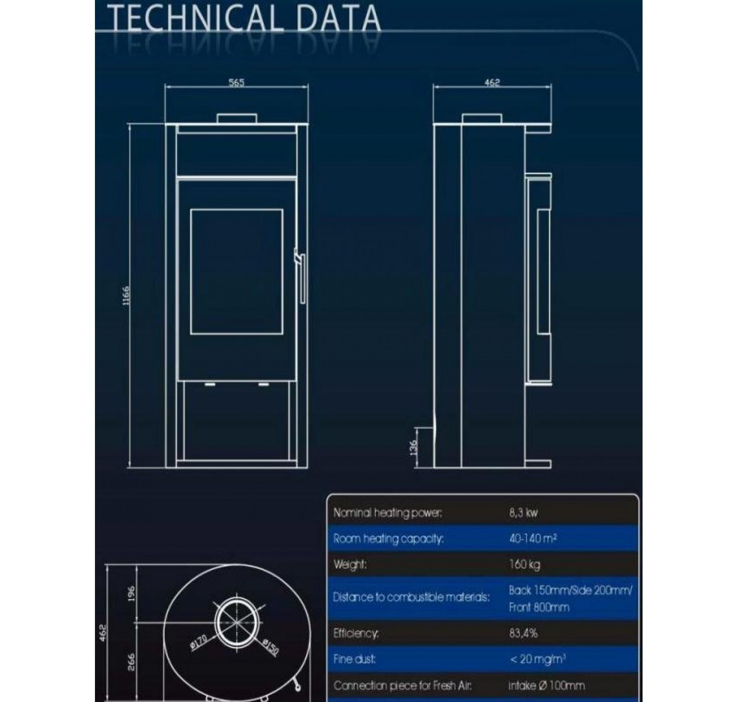 - Диаметр дымохода, (мм) 150 мм.