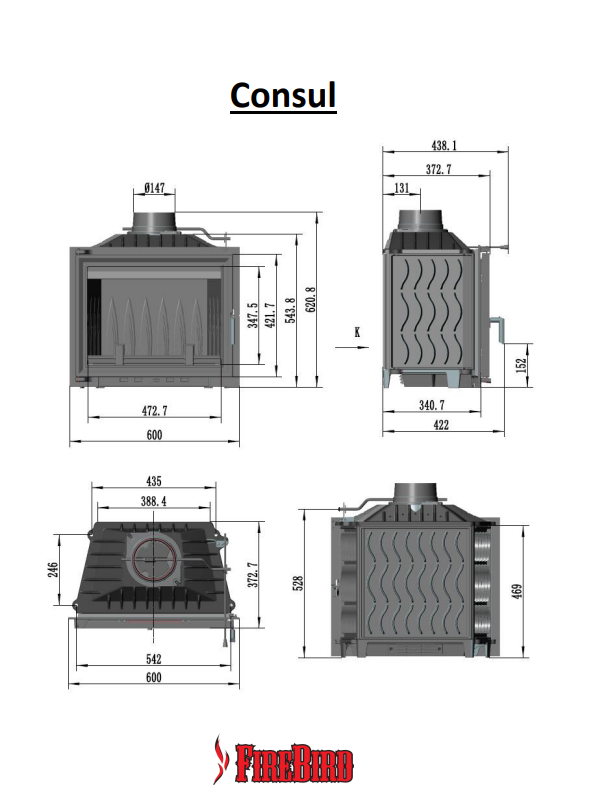 Печь-камин Firebird (Файрберд) Consul – это чугунная топка для дровяного камина. Для сохранения и длительной отдачи тепла в качестве материала выбран теплоемкий чугун. Относится к типу топок длительного горения с жаропрочным прозрачным стеклом. В топке для притока воздуха оборудован чугунный колосник.
