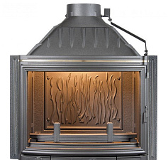 Каминная топка оснащена системой очистки стекла, встроенным шибером и системой подводки внешнего воздуха в камеру сгорания, а также оборудована цепным механизмом подъема двери, съемной колосниковой решеткой и ножками, которые дадут возможность установить топку на неровной поверхности.
