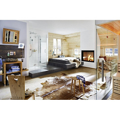 Топка Panoramique 900 - это топка с панорамным полукруглым стеклом , выполненная из легированной стали. Очаговая зона выложена высокопрочным огнеупорным кирпичом со швами. Ширина очага 700мм, глубина очага 530 мм. Высота видимой части пламени 545 мм. Очаг выложен маленькими кирпичными блоками со швами. Размер блока 55х220 мм. Подъемная ручка двери изогнутая 12 см.