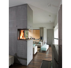 Классическая закрытая двухсторонняя каминная топка с двумя открывающимися дверцами. Топка футерована шамотным кирпичом. Эта разделяющая топка предназначена для установки непосредственно в стене.