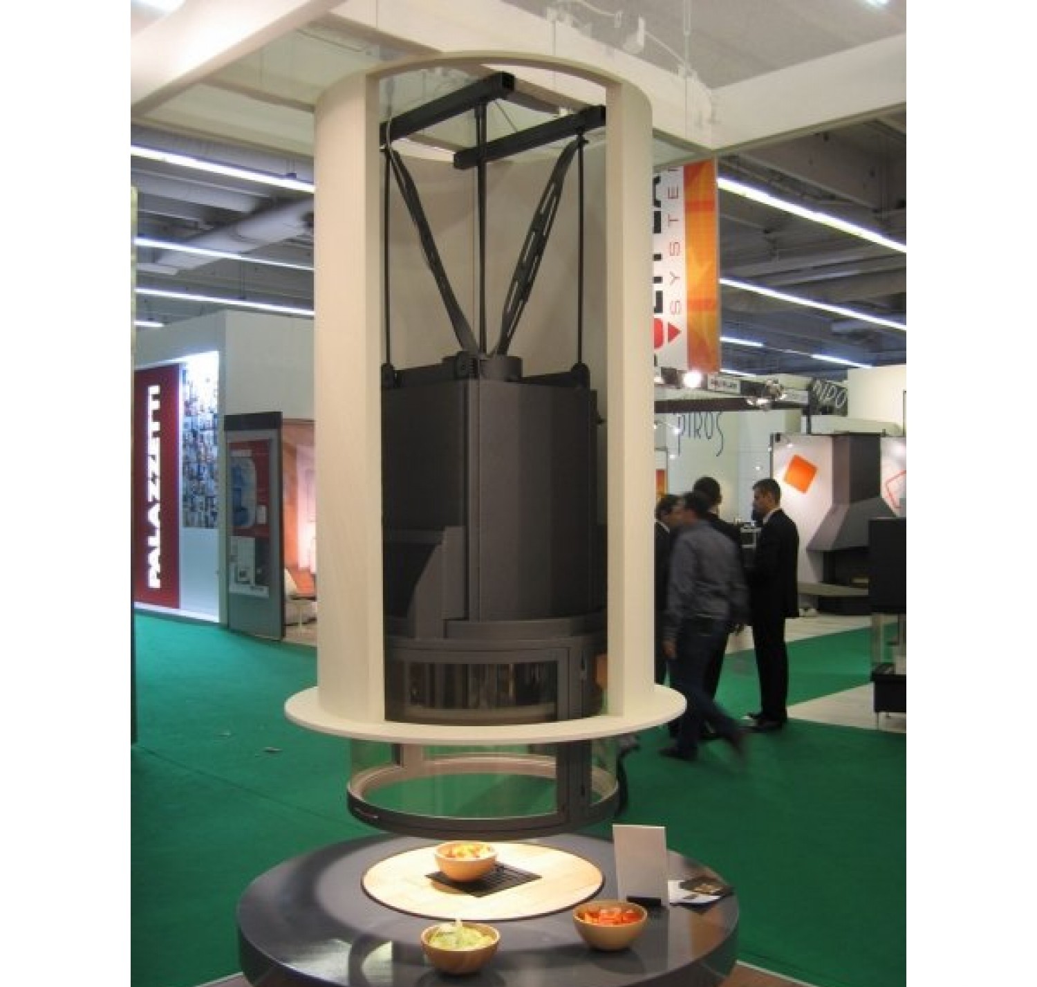 Топка предназначена для установки только в центре комнаты, оснащена подъемным механизмом, с помощью него все стекла поднимаются вверх. Две противоположных стекла открываются вбок для удобства чистки камина. Корпус топки выполнен из легированной стали. Для установки топки необходимо дополнительно заказывать систему подвешивания. В зависимости от ситуации установки необходимо выбрать подходящий вариант подвешивания топки исходя из высоты помещения и верхней фиксации крепления. Очаговая зона основания выложена высокопрочным огнеупорным кирпичом.