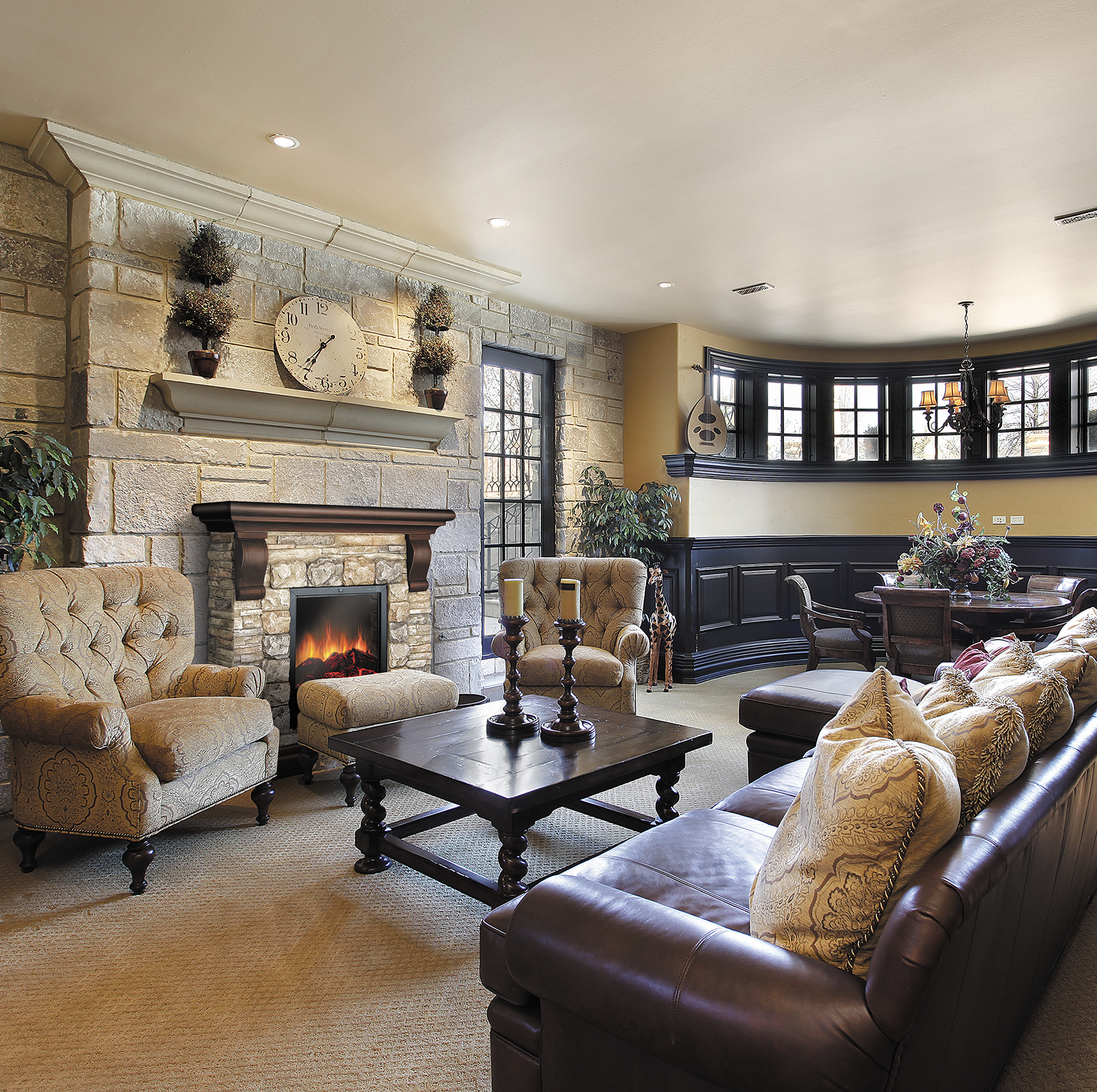 Камин с декоративным порталом выполнен в классическом стиле, имитирующем кладку из темного камня вокруг камина с декоративными элементами из дерева. Покрытие из тёмного камня с резными деталями из дерева является оптимальным дополнением для любого интерьера, и подарит атмосферу уюта, тепла и комфорта любому дому.
