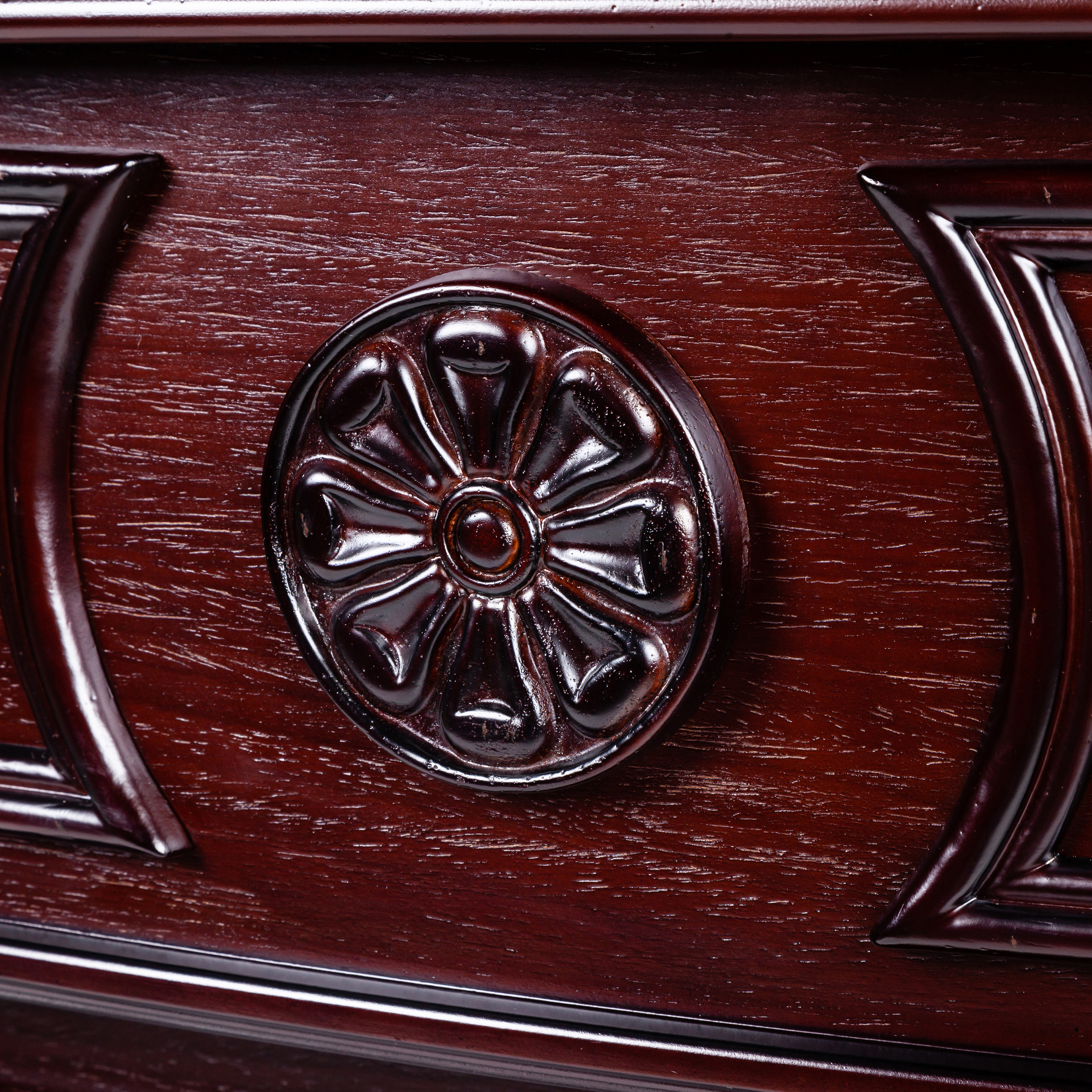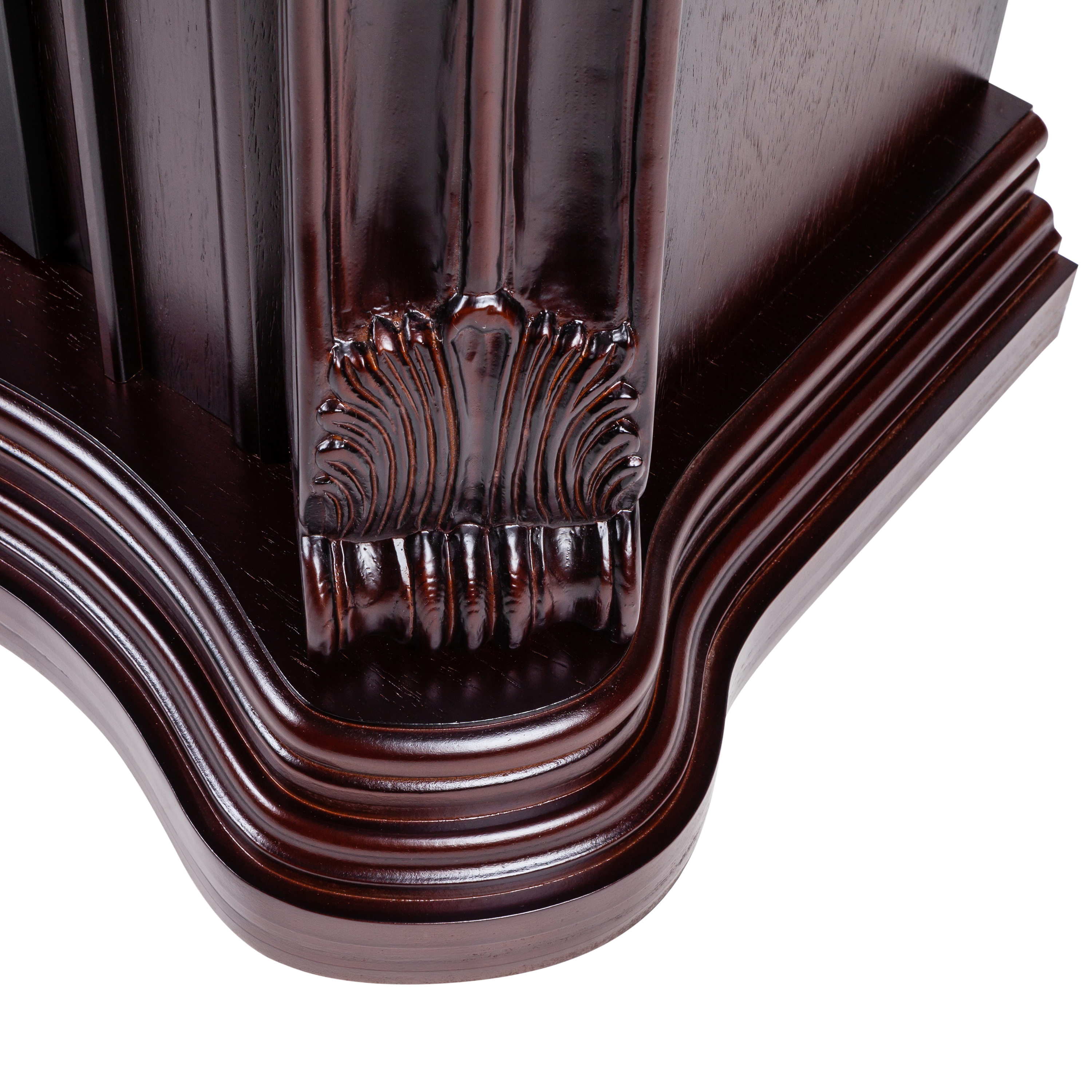 - Выполнен из качественного МДФ, тонированного в цвет античного дуба. Изысканная форма портала, верхняя панель украшена аппликацией из натурального шпона, карниз портала декорирован профилем и прекрасно выполненными резными листьями.