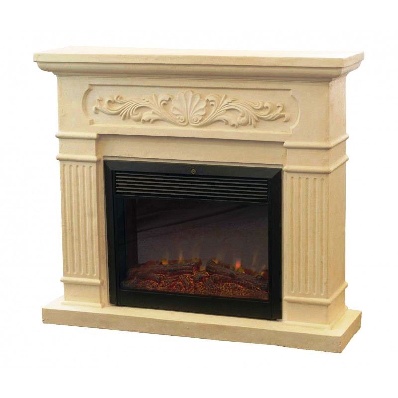 - Портал станет ярким акцентом современного интерьера, благодаря лаконичности форм и оригинальности текстуры. Сдержанный дизайн обрамления с элементами замкового стиля подчеркивается природной фактурой под натуральный камень. Такой камин добавит в обстановку комнаты солидности, а светлый оттенок портала визуально не перегрузит пространство.