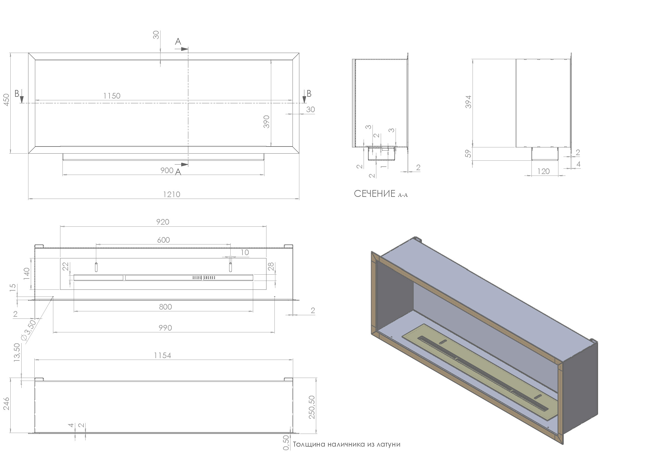Встраиваемый биокамин с размерами корпуса ДхВхГ 1210х450х250 мм. Изготовлен из стали толщиной 2 мм. Окрашен черной порошковой краской с фактурой Муар. На заднюю стенку вклеено стекло стемалит черного цвета, впереди установлено защитное стекло на стеклодержателях. Топливный блок с длинной линии огня 800 мм.